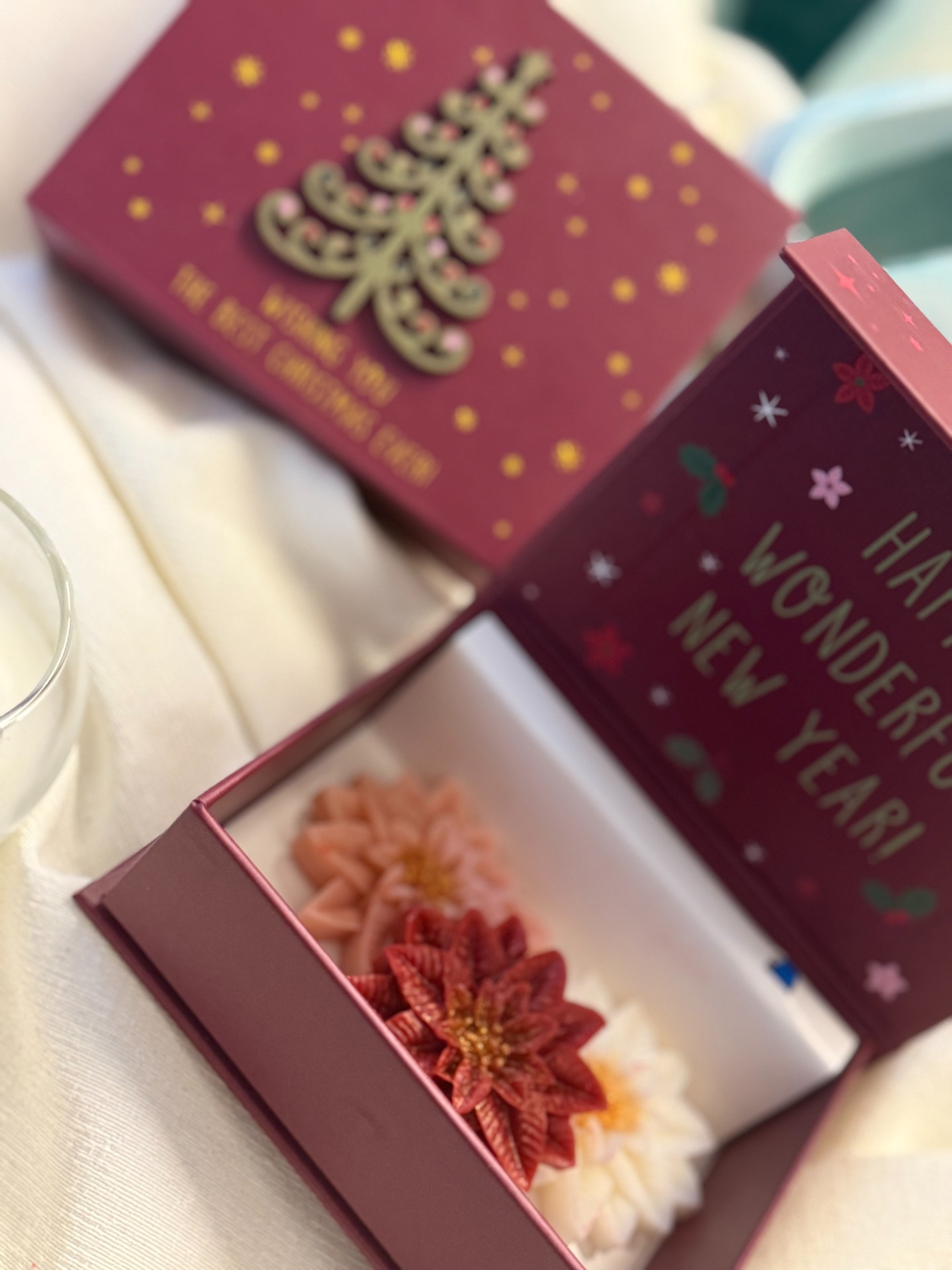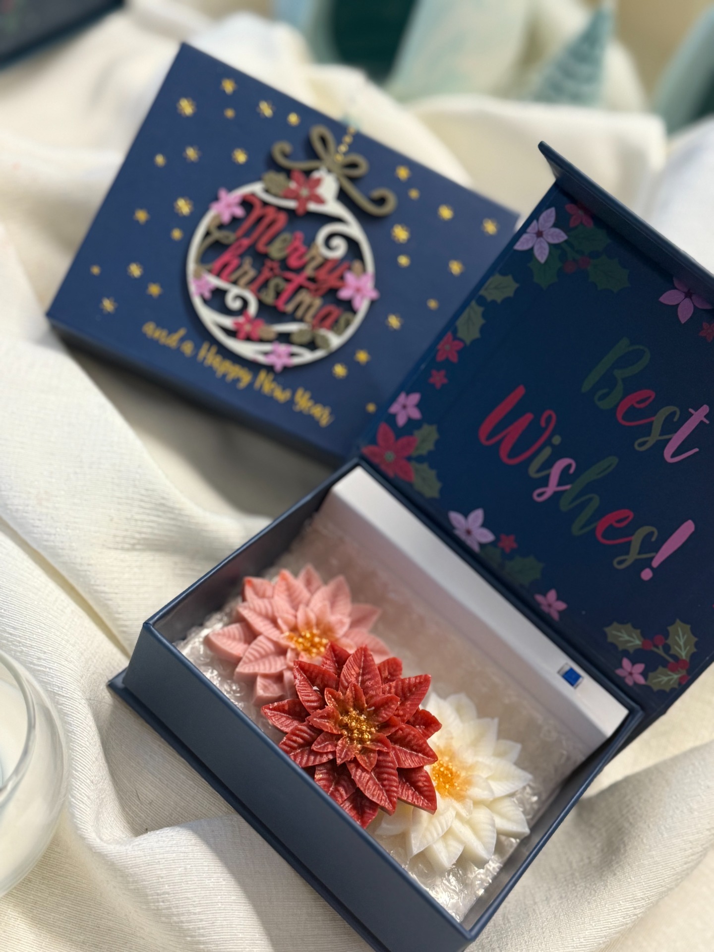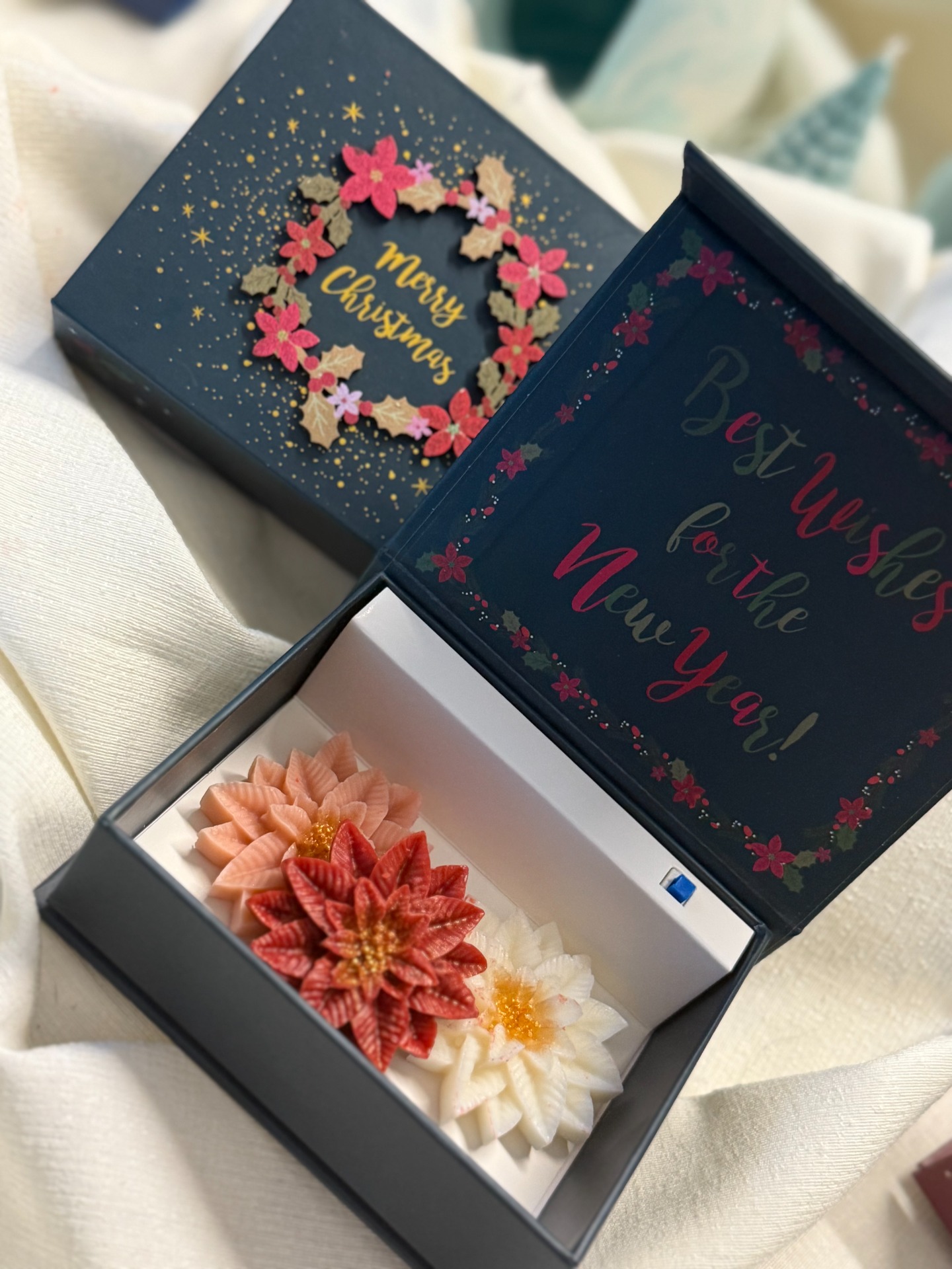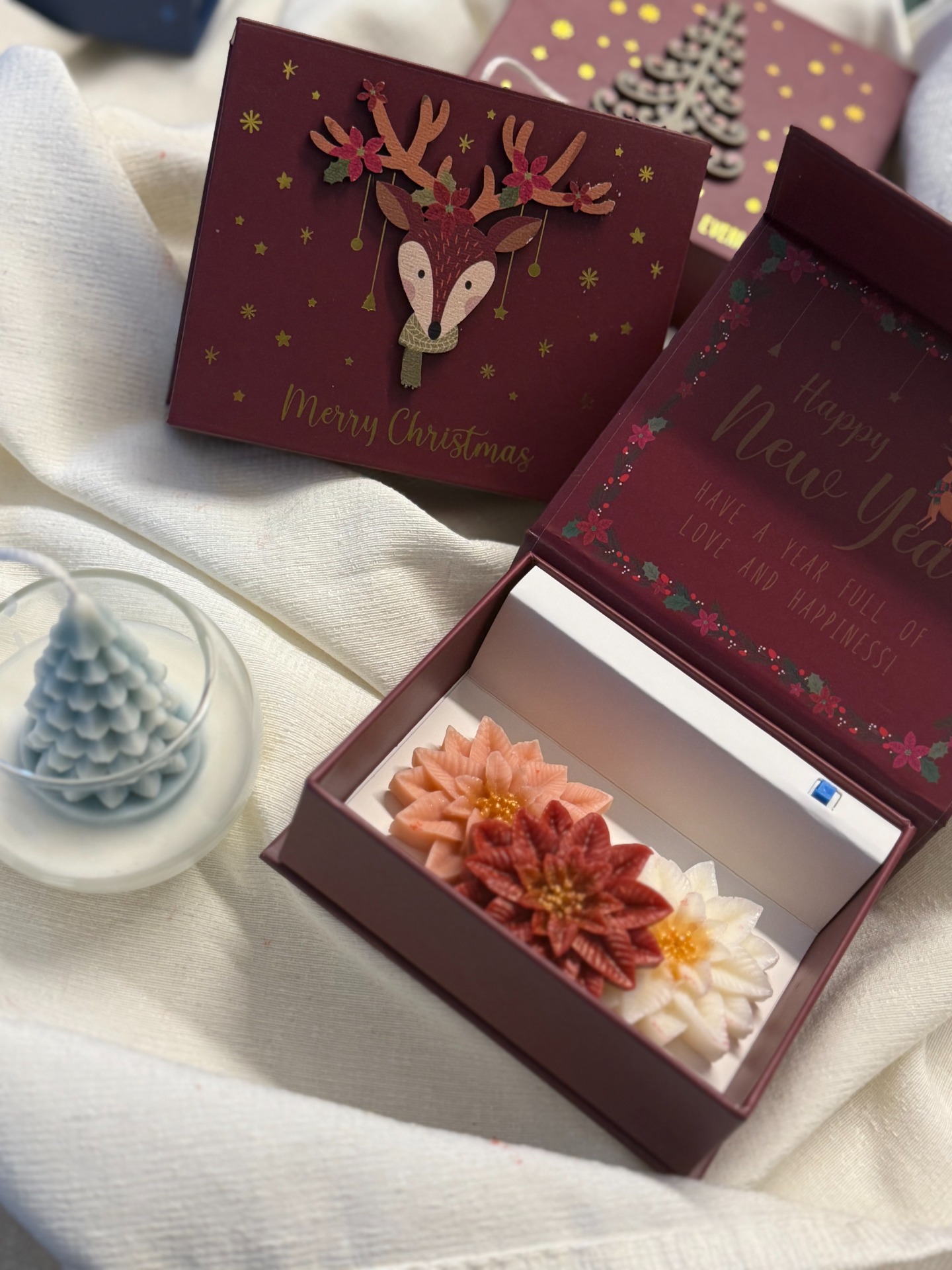 Limitovaná edice hudebních vánočních krabiček, které při otevření zahrají jemnou vánoční melodii a uvnitř ukrývají tři ručně vyráběné vonné vosky ve tvaru vánočních hvězd – v bílé, růžové a červené barvě.